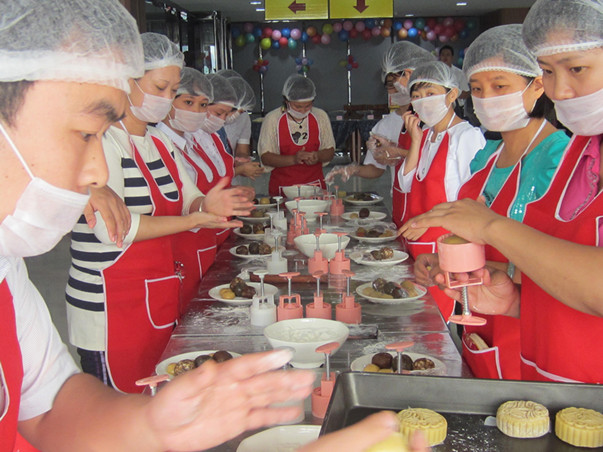 走進(jìn)世博大廈服務(wù)中心,鮮花隨處可見,華美的裝修設(shè)計(jì)使人心曠神怡,現(xiàn)場(chǎng)充滿了濃郁的節(jié)日氛圍。大家熱情高漲、十分投入,和面、搟皮,包餡,然后刷上蛋液,撒上芝麻,最后烘烤出爐。員工們邊動(dòng)手制作月餅邊盡情享用自己的“完美作品”,并拍照留念,記錄下了許多歡樂的瞬間。而現(xiàn)場(chǎng)專業(yè)的月餅師傅則耐心地傳授制作月餅的要領(lǐng),聽得大伙頻頻點(diǎn)頭。另外,除了可以親手制作月餅,還可現(xiàn)場(chǎng)烘焙,讓員工們可現(xiàn)場(chǎng)品嘗至自己制作的月餅,活動(dòng)現(xiàn)場(chǎng)處處洋溢著溫馨和美的氣氛……
