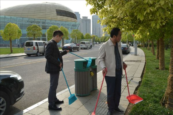 顧不上欣賞春光明媚、水靜人和的美景,碧波蕩漾的如意湖畔出現了建投志愿者服務隊的身影,大家拿起掃帚、垃圾袋等工具一路前行,看見沿岸偶爾零散的垃圾或不易發現的紙屑便主動上前進行清理,很快,如意湖周邊的石柱、圍欄、長椅就煥然一新,廣場周邊散落的紙屑、煙頭也被清掃干凈。