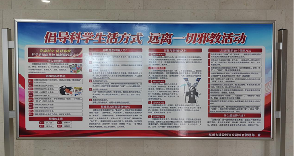 為了進一步提高國企員工反邪教意識,認識邪教的危害,切實增強自覺抵御邪教侵蝕的能力,營造積極向上、健康和諧的工作氛圍。4月25日下午,鄭州市建設投資集團有限公司組織全體干部員工開展反對邪教宣傳活動。利用PPT宣講、宣傳展板、網站、懸掛橫幅等方式,向員工宣傳邪教的種類、危害和邪教組織的種類等,引導國企干部職工認清邪教本質,提高識邪、防邪、拒邪能力,筑牢反邪教思想防線,做到對邪教歪理邪說不聽、不看、不信、不傳。